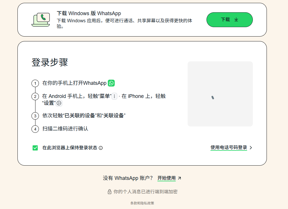 - 在电脑浏览器打开https://web.whatsapp.com/,页面会出现二维码。